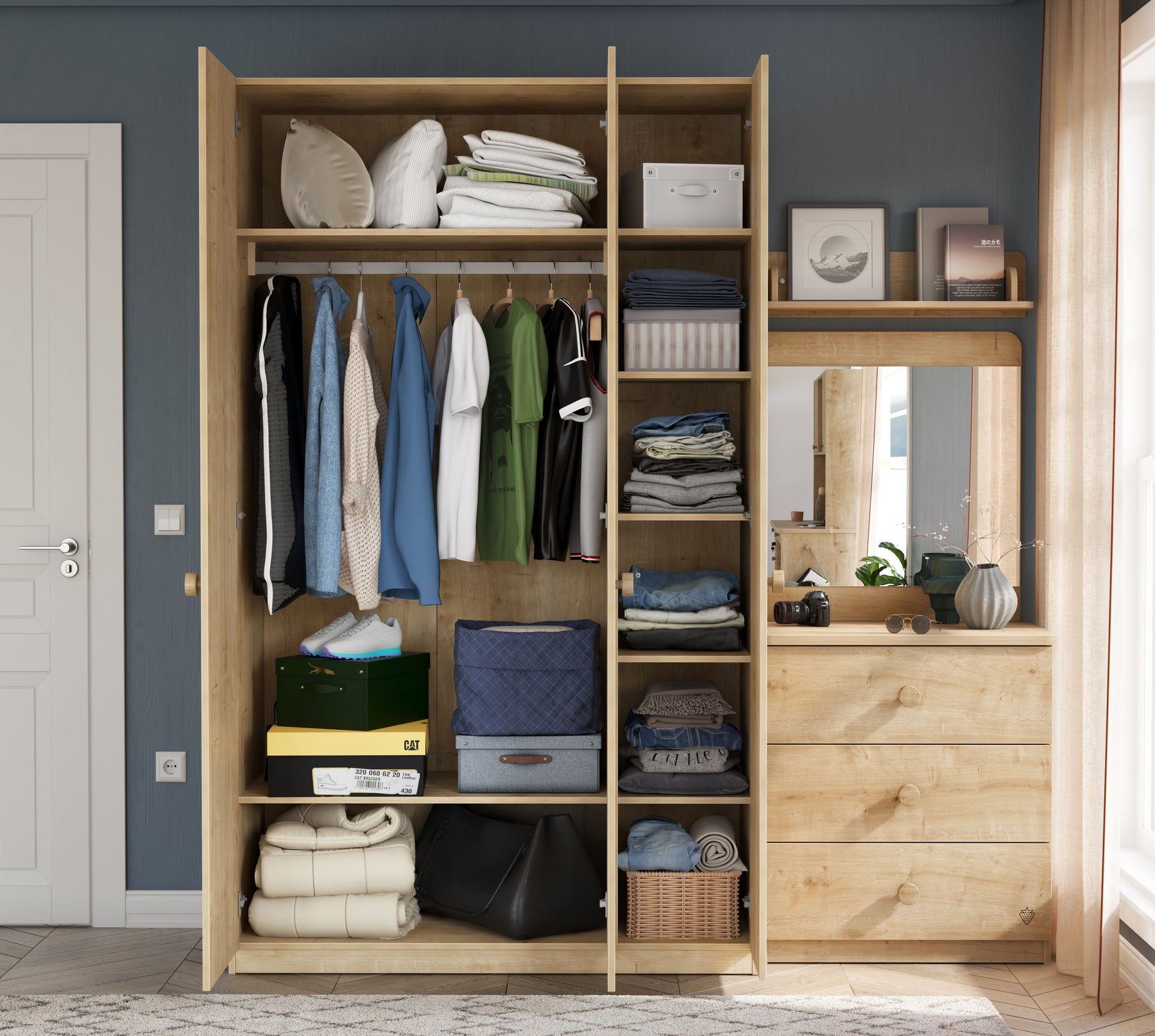 Завдяки численним полицям та просторий внутрішній об'єм, Шафа Mocha з 3 дверцями Line пропонує безшумне та безпечне використання завдяки системі повільного відкривання петель на дверцятах. Шафа Mocha з 3 дверцями Line, яка виглядає стильно завдяки дерев'яним ручкам та чітким лініям, забезпечує можливість доступу до всіх речей у шафі завдяки широкій штанзі для одягу.