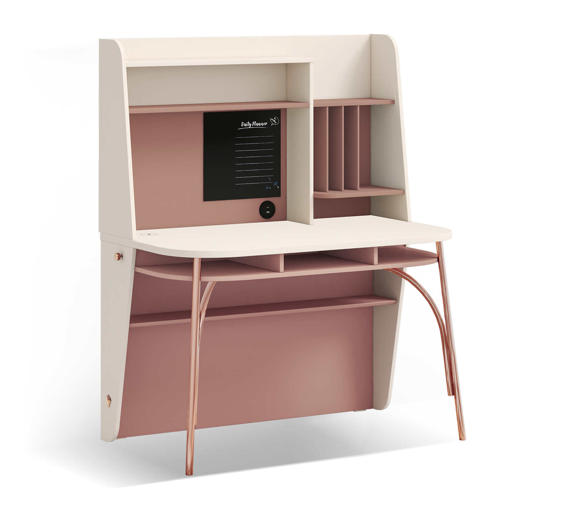 Благодаря гармонии цветов Розетта и Кремового Бежевого, он предлагает эстетичный вид, в то время как металлические ножки с покрытием розового золота придают окружению изящный акцент. Эргономичные размеры обеспечивают пользователю комфортный и эффективный опыт работы.