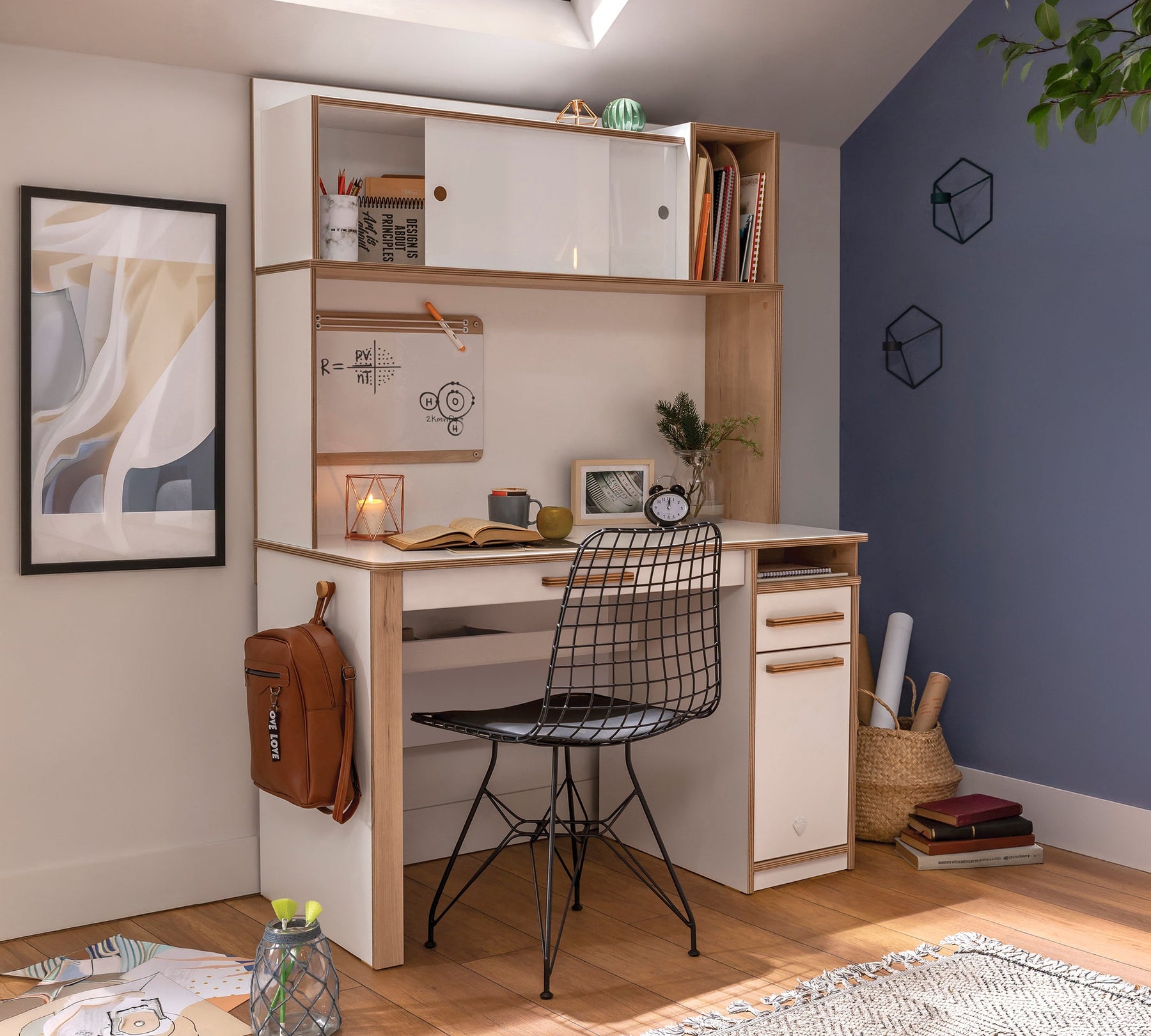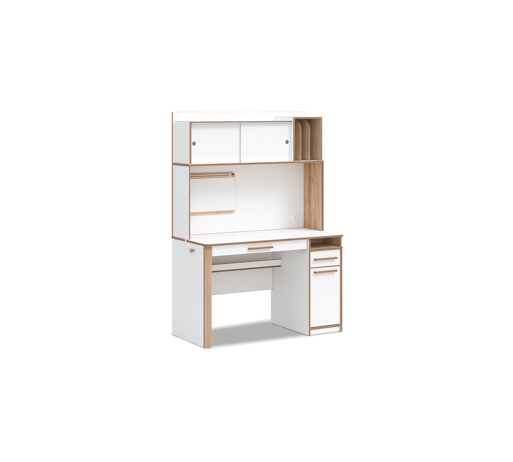 Стол Modera Унители Широкий Рабочий Стол разработан с учетом всех потребностей молодежи для их работы в жилых пространствах, сочетая функциональность и комфорт. Наличие ящиков, полок, закрытого шкафа, деревянного вешалки и внутренних отделений помогает поддерживать порядок в комнате молодого человека. Ящик содержит разделитель для канцелярских принадлежностей, который также может быть размещен в других отделениях.