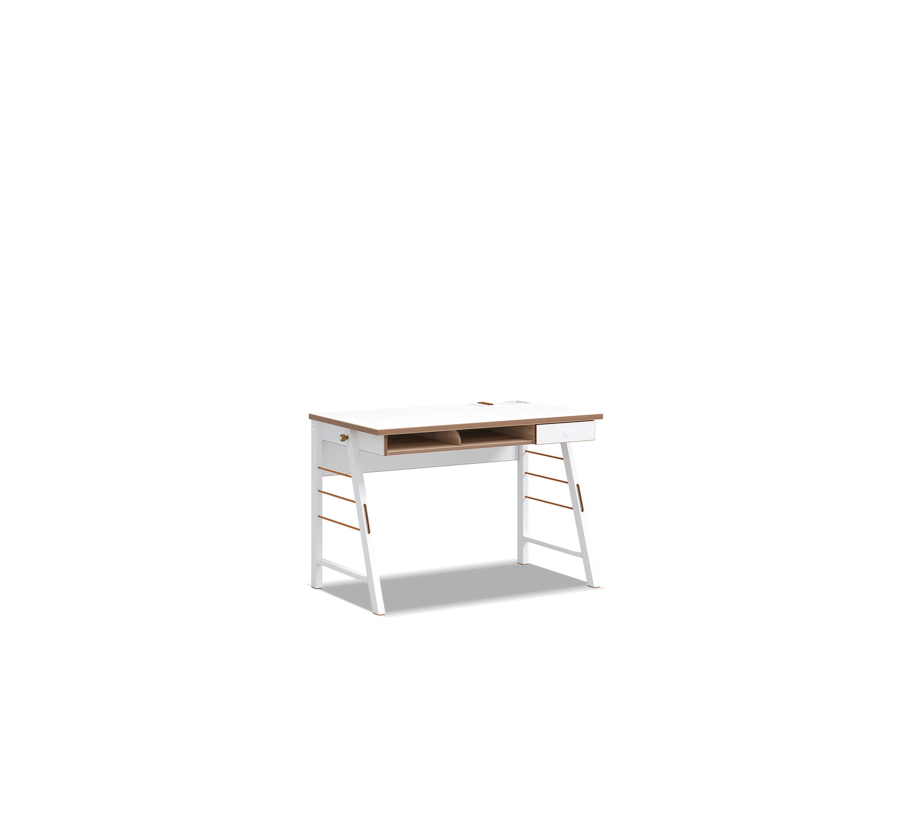 Два отделения открытой полки в нижней части рабочего помещения обеспечивают легкий доступ к вещам, необходимым в повседневной жизни, от книг до блокнотов. Металлические ножки, использованные с обеих сторон стола, придают дизайну современный вид и выделяются своей прочностью. Деталь в виде крючка на металлических ножках позволяет удобно вешать такие вещи, как сумка или наушники. Резинка, добавленная между ножками, обеспечивает звукоизоляцию и смягчает удары.