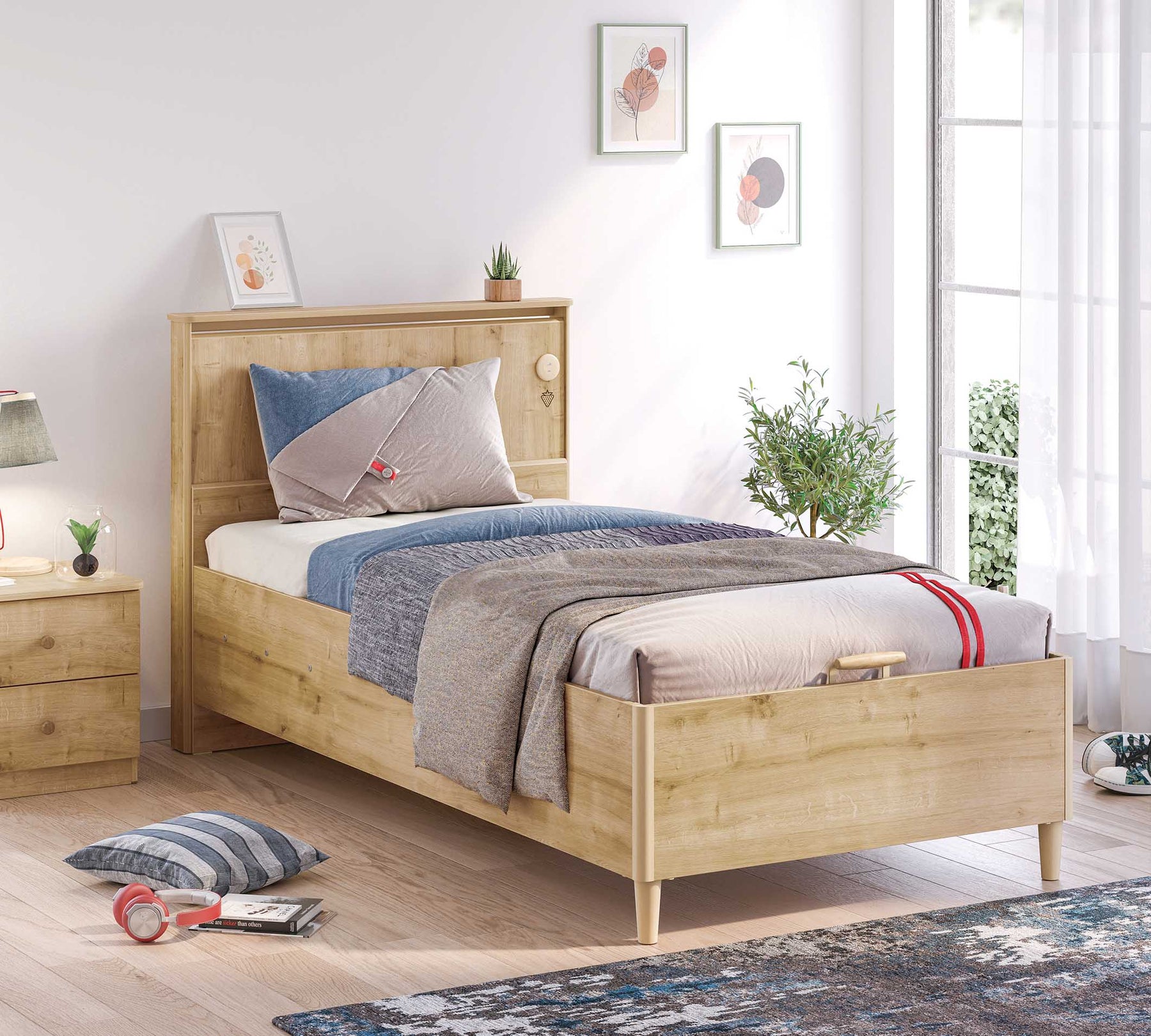 Головки також гармонійно підходять до ліжка та базового модуля, а з двома різними дизайнами, які ми пропонуємо як опцію, ми знайшли місце для всього, що вам може знадобитися.